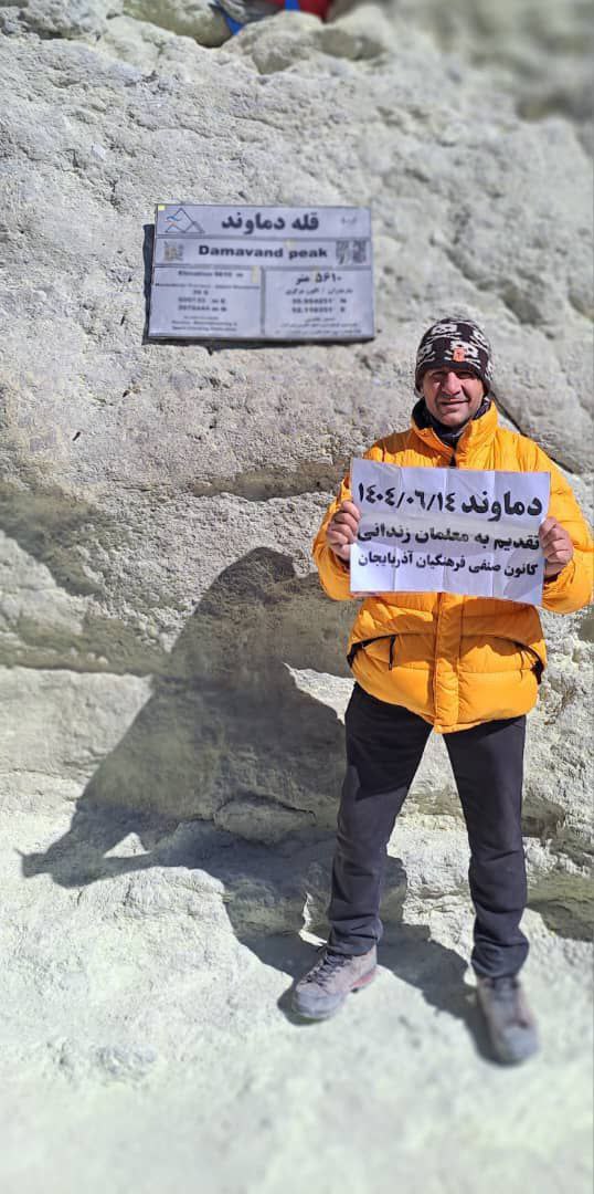 بهرام یعقوبی عضو کانون صنفی فرهنگیان آذربایجان با صعود به بام ایران قله دماوند آن را به معلمان زندانی ایران تقدیم کرد.
