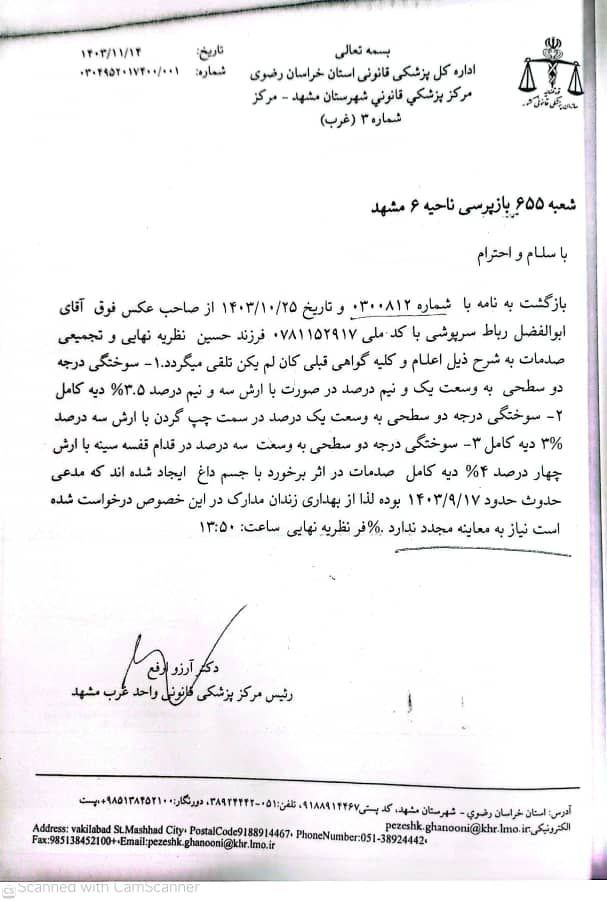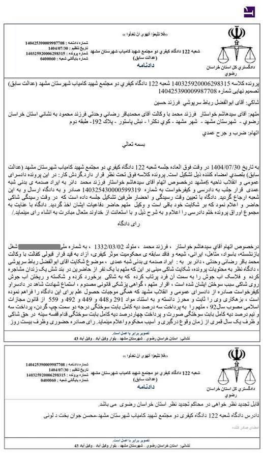 در رأی صادر شده علیه مهندس خواستار او به خاطر« ایراد صدمه بدنی شبه عمدی» به پرداخت به پرداخت ۳/۵ درصد دیه‌ی کامل بابت سوختگی درجه دو سمت چپ گردن، نیم درصد دیه کامل، بابت سوختگی صورت و چهار درصد کامل بابت سوختگی قفسه سینه محکوم شده است.