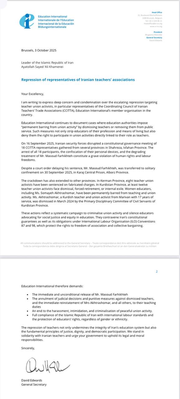 اینجانب با ابراز نگرانی عمیق و محکومیت شدید نسبت به تشدید سرکوب فعالان صنفی معلمان، بهویژه نمایندگان شورای هماهنگی تشکلهای صنفی فرهنگیان ایران، سازمان عضو آموزش بینالملل در کشور، این نامه را مینویسم.