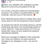 از جامعه جهانی آموزش، معلمان، اتحادیههای آموزشی و حامیان حقوق کودک دعوت میشود پیام همبستگی خود را به اشتراک بگذارند. صدای شما و حمایتتان پیامی نیرومند برای همکاران ما در ایران خواهد بود: