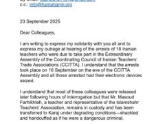 در ادامهی گسترش موج حمایتهای بینالمللی از معلمان و فعالان صنفی ایران، اتحادیه آموزش ملی بریتانیا (National Education Union – NEU) با ارسال نامهای رسمی به شورای هماهنگی تشکلهای صنفی… ادامه مطلب »