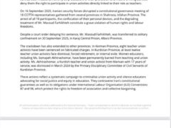 انجمن صنفی معلمان کوردستان (شعب مریوان و سروآباد، سقز و زیویه، سنندج) با انتشار بیانیهای در تاریخ ۱۱ آبان ۱۴۰۴، از زیتون کهزادی و مهری خسرویزاده، مدیر و معاون مدرسه… ادامه مطلب »