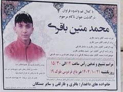 ارسالی مخاطبین محم دمتین باقری، ۱۶ ساله که روز ۱۸ دیماه در بازار مسکن کرمانشاه به قتل رسید. این نوجوان ۱۶ ساله در جریان فراخوان ۱۸ دیماه، در بازار مسکن… ادامه مطلب »