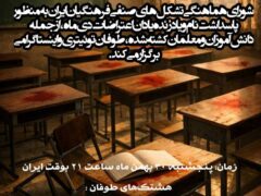 چهارشنبه ۲۹ بهمن برای نیمکتهای خالی و کلاسهای بی معلم بیش از ۲۳۰ کودک و نوجوان کشته شدهاند. مدرسه باید جای امنیت باشد، نه سوگ. فراخوان شورای هماهنگی تشکلهای صنفی… ادامه مطلب »